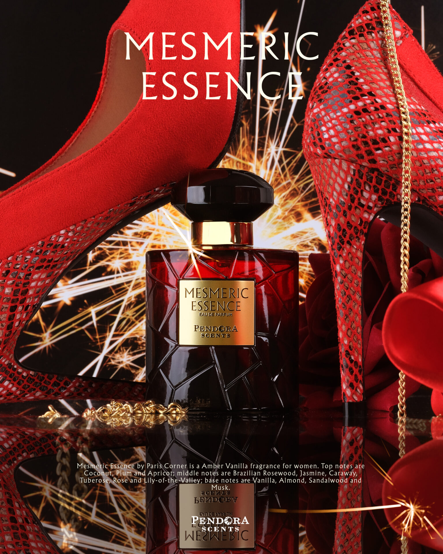 Description: A creamy, intoxicating blend of vanilla and almond, rounded with rich florals and warm woods. Hypnotic and sultry, perfect for nighttime allure.